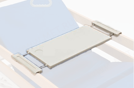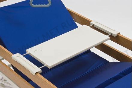 Надкроватный столик из пластика, устанавливаемый на боковые ограждения шириной он 80 до 105 см.