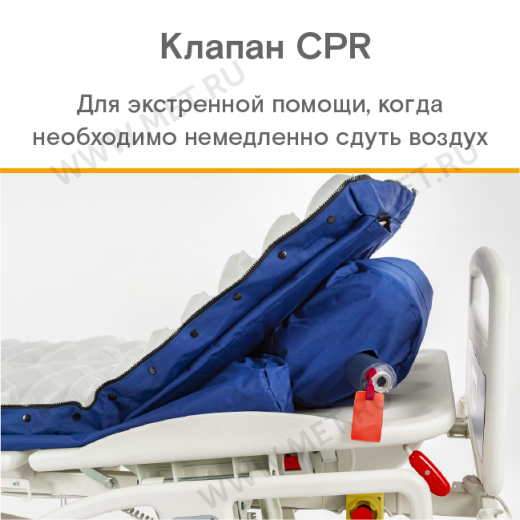 Таким образом, MET AIR BRIO не только оказывает профилактическое и лечебное действие на пролежни, но и дает те же преимущества, что и функциональная кровать. Система позволяет принять сидячее положение для полной вентиляции легких, поднятие ног для борьбы с варикозом и отечностью, переворот для разгрузки сердечной мышцы, и в целом облегчает уход за пациентом.