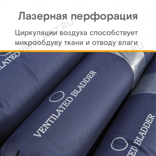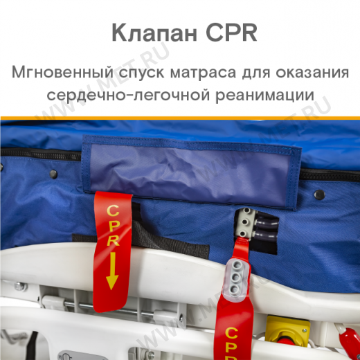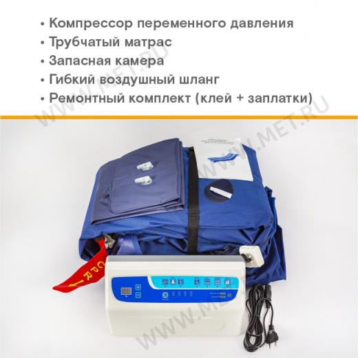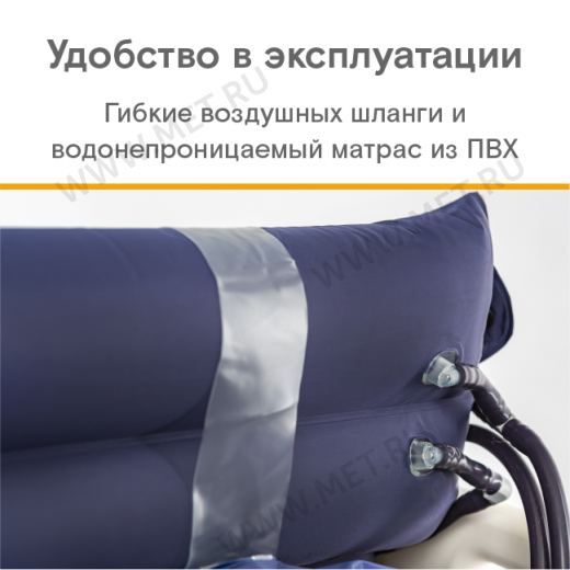 Противопролежневая система переменного давления MET AIR PRO-1000 разработана для лечения и профилактики пролежней средней тяжести, вызванных длительным постельным режимом. Матрас состоит из 19 воздушных камер индивидуально заполненных воздухом. Камеры поочередно надуваются и сдуваются при помощи компрессора, удерживая таким образом вес на определенных участках тела и позволяя кровотоку достигать различных участков тела обездвиженных или ослабленных пациентов.