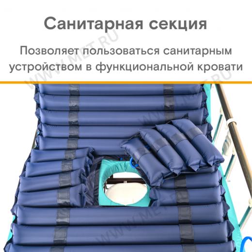Противопролежневый матрас трубчатого типа с попеременно надувающимися 24 воздушными камерами и закрывающимся отверстием для туалета. Возможно применение на кроватях с туалетом любого типа. Электрокомпрессор нагнетает воздух в камеры матраса поочередно, в задаваемом ему ритме, в различные камеры противопролежневого матраса.