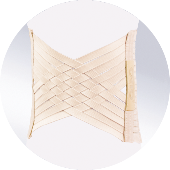 Основа изделия изготовлена из воздухопроницаемого эластичного полотна с особой разреженной вязкой, снабжена тонкими пластичными металлическими планшетками.Передняя часть бандажа выполнена из переплетения тонких эластичных ремней. Фиксация осуществляется с помощью дискретной застежки «Велкро».