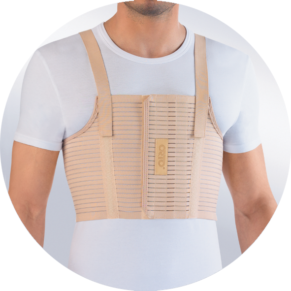 Бандаж разъемный на грудную клетку для мужчин с основой анатомической формы из эластичного полотна. Снабжен верхними эластичными лямками. Усилен металлическими планшетами. Фиксация бандажа осуществляется с помощью дискретных застежек «велкро».