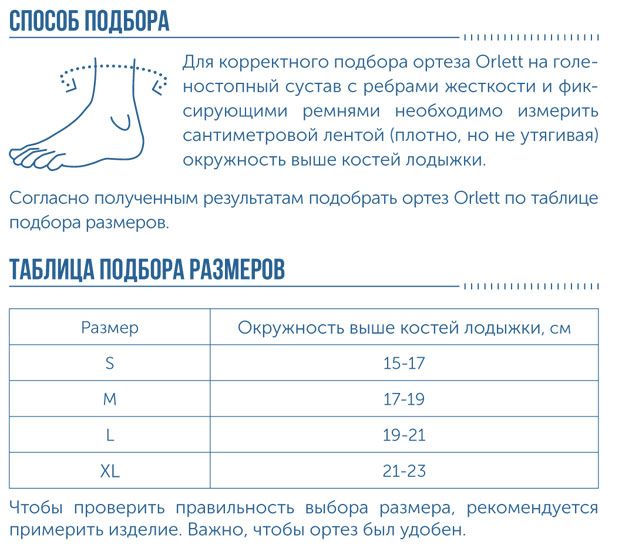Ортез Orlett на голеностопный сустав стабилизирует положение голеностопного сустава в физиологически правильном положении и осуществляет фиксацию области лодыжек, голеностопного сустава, суставов предплюсны, снижает нагрузки на голеностопный сустав.