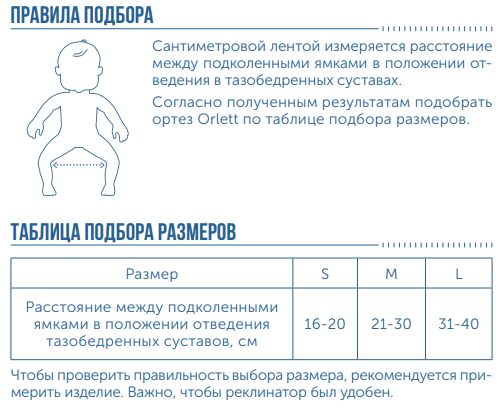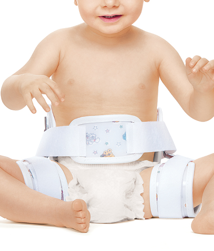 Конструкция ортеза на тазобедренный сустав, отводящего при врожденном вывихе и дисплазии тазобедренного сустава (отводящая шина-распорка) обеспечивает полную фиксацию тазобедренных суставов в положении отведения без нагрузки на плечевой пояс и позвоночник ребенка.