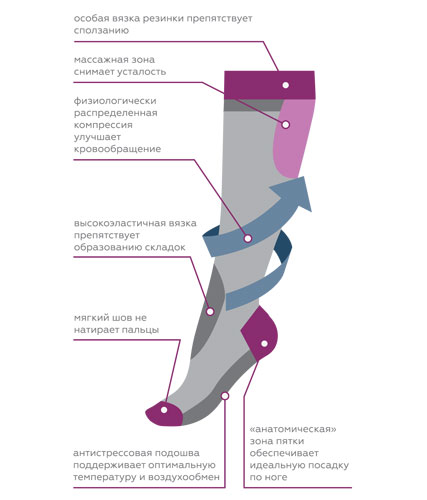 Эффективная профилактика и лечение варикоза обеспечиваются благодаря градуированной физиологически распределенной компрессии.