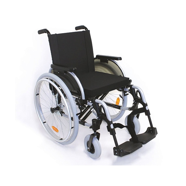 Рама из высокопрочного алюминиевого сплава, складная, трехтрубного исполнения.Вилка поворотного колеса регулируемая в 4-х положениях.Спинка кресла-коляски стабильная благодаря дополнительному креплению к раме в трех местах.Подлокотники регулируются по высоте в диапазоне 2 см, в 2 положениях.Колеса:комнатный вариант: литые передние 6 дюймов или 8 дюймов; приводные 24 дюйма. прогулочный вариант: пневматические передние 8 дюймов; приводные 24 дюйма.Приводные колеса с механизмом быстросъемных осей (с пружинно-шариковыми фиксаторами) регулировкой положения по ширине при помощи втулки.Спинка и сиденье из синтетической ткани армированной нейлоновыми волокнами.Спинка с люмбальным изгибом.Съемные, отводящиеся внутрь и в стороны подножки с опорами для стоп, регулируемыми по углу наклона.Отводящиеся назад подлокотники (для манипулирования одной рукой узла фиксации подлокотника, он не обладает возвратной пружиной).Встроенный в раму опрокидыватель.Регулируемый стояночный тормоз.Ремни для поддержки голеней.Подушка противопролежневая, 5 см.