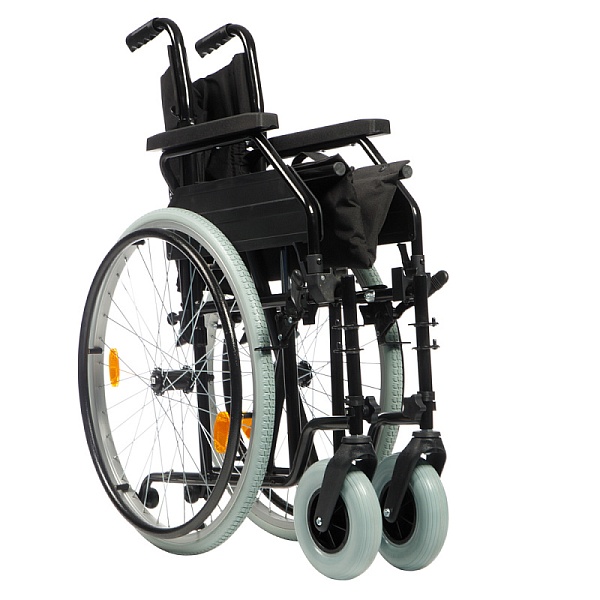 Складная конструкция.Складная спинка.Откидные, съемные подлокотники.Скошенная форма подлокотников.Боковая грязезащита.Откидные, съемные подножки, регулируемые по длине.Откидные опоры для стоп.Ручные стояночные тормоза.Быстросъемные задние колеса с кнопочной фиксацией.Быстросъемные передние колеса.Съемные колесные антиопрокидыватели.Ремень для голени.Карман на спинке.Светоотражатели на задних колесах.