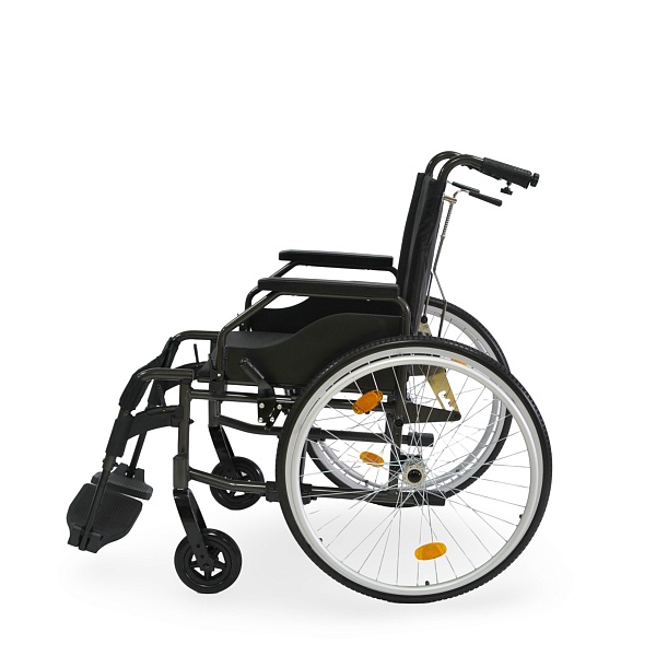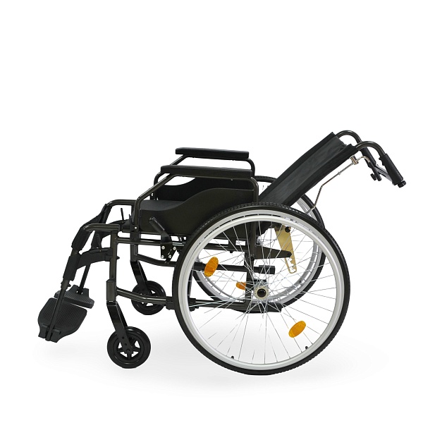 Простота в эксплуатации: Легко складывается и раскладывается без инструментов.Прочная и легкая рама: Алюминиевая конструкция устойчива к коррозии и отличается малым весом.Регулируемая спинка: Откидывается до угла 140°Износостойкие материалы: Сиденье и спинка выполнены из прочного нейлона.Задние колеса: Быстросъемные, литые, с алюминиевыми ободами и встроенными светоотражателями (катафотами). Возможна регулировка по высоте.Передние колеса: Литые, обеспечивают плавное и устойчивое движение.Ручки для сопровождающего: Оснащены дополнительной горизонтальной перекладиной для усиления жесткости.Удобные подлокотники: Откидные, с мягкими полиуретановыми накладками.Функциональные подножки: Съемные, с возможностью регулировки по высоте (5 положений). Изготовлены из алюминия, с пластиковыми опорами для ног.