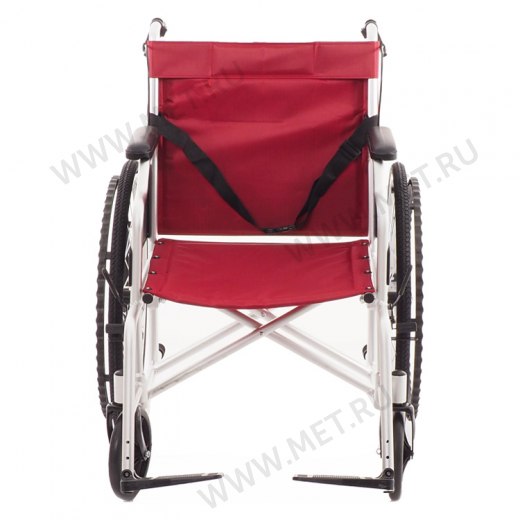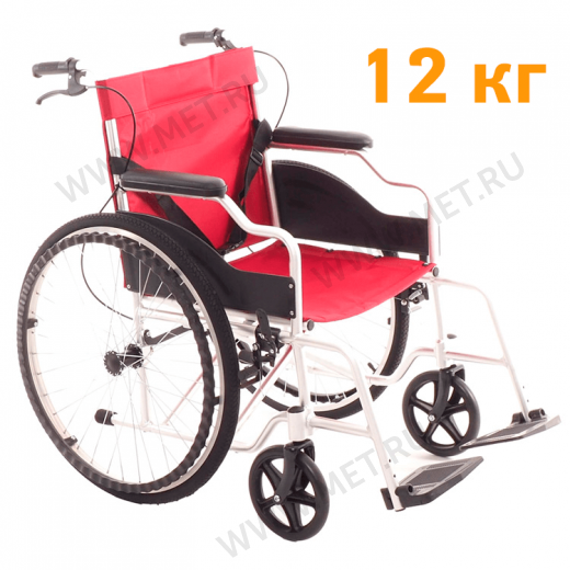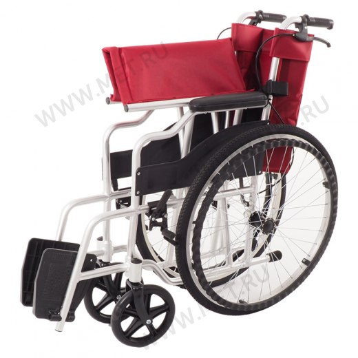 Кресло-коляска для инвалидов с сиденьем из бордового полиэстера и тормозами для сопровождающего, алюминиевая рама, вес коляски всего 12 кг.