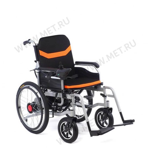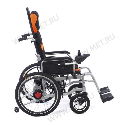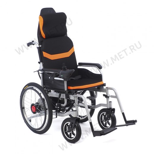 Электрическое кресло-коляска со съёмным удлинением спинки, ортопедическим подголовником и приводными колёсами, позволяющими энергонезависимое перемещение.