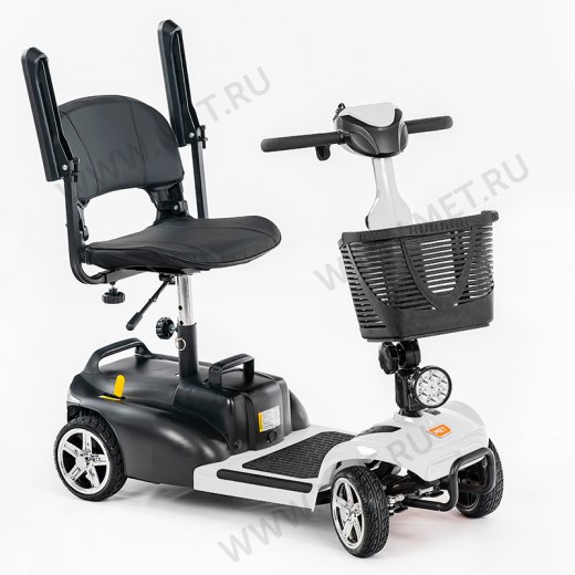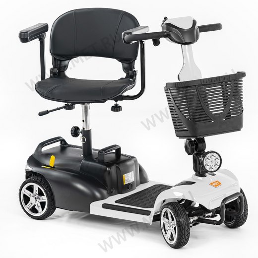 Электрический скутер для старшего поколения, снабжённый рулём мотоциклетного типа и поворотным сиденьем с откидывающимися подлокотниками, которое делает посадку и высадку из кресла элементарной даже для пользователей, имеющих ощутимые трудности с перемещением.