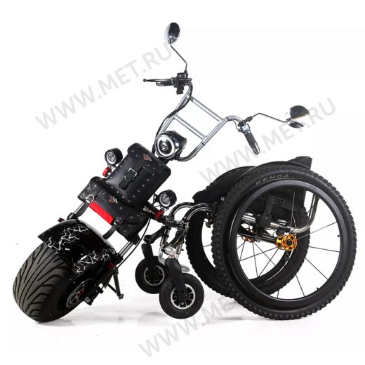 Динамические особенности электропривода, удобная чопперная посадка, комплект оптики с указателями поворота и комфорт широкого протектора в эластомерной амортизационной вилке с 80 мм ходом сделают из Вашего механического кресла-коляски полноценное транспортное средство с завидными техническими характеристиками.