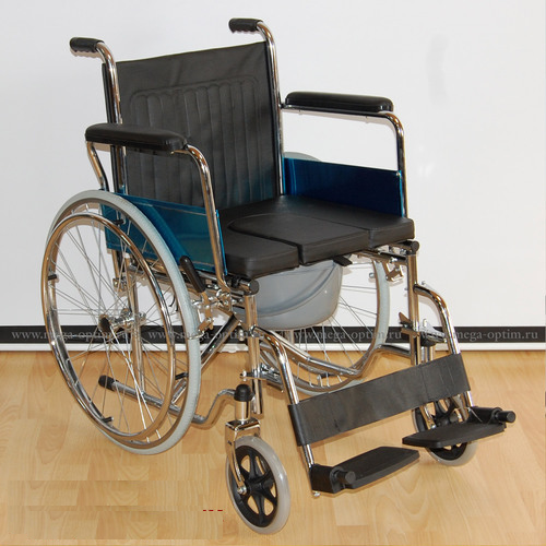 Кресла-коляски инвалидные складные предназначены для пере-движения больных и инвалидов с частичной потерей функций опорно-двигательного аппарата в условиях помещений и на площадках с твёрдым покрытием для преодоления незначительных расстояний. Рама выполнена из хромированной стали. Откидные подлокотники. Модель оснащена литыми задними колесами, цельнолитыми передними, съемными подножками. Сидение со съемным U-образным вырезом, быстросъемным санитарным устройством.