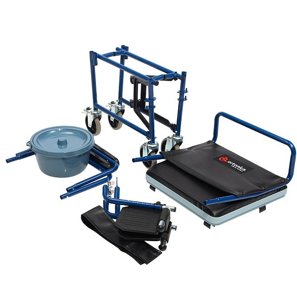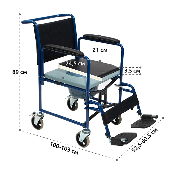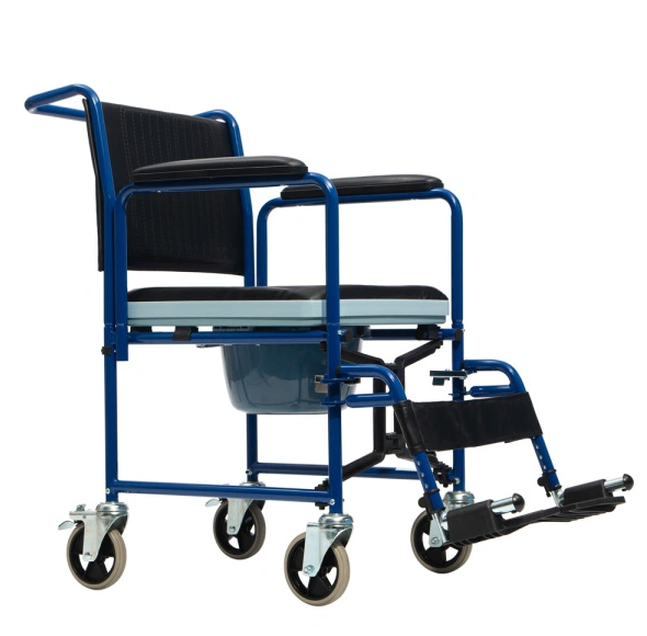 Унифицированная конструкция стула, позволяющая использовать кресло совместно со стационарным унитазом.Съемные подлокотники, оснащенные мягкими накладками для опоры рук.Съемные, откидные подножки, регулируемые по длине.Откидные опоры для стоп.Мягкие спинка и сиденье с покрытием из искусственной кожи.Цельнолитые передние и задние колеса.Разборная конструкция.