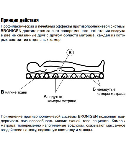 Противопролежневая система Bronigen BAS-4000 C баллонного типа используется в комплексной терапии лечения пролежней и для профилактики образования пролежней у пациентов вынужденных долгое время проводить в лежачем положении, после инфарктов инсультов, травм, ожогов и других заболеваний.