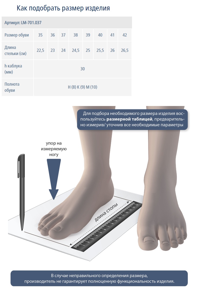При выборе обуви правильно подбирайте ее по размеру и полноте с учетом индивидуальных особенностей стопы. Обувь не должна причинять Вам неприятных ощущений, стопа не должна быть сжата. В случае несоответствия размера возможна деформация обуви, расхождение швов, разрыв материала. При надевании расстегните или развяжите все застежки и отрегулируйте их по своей стопе.