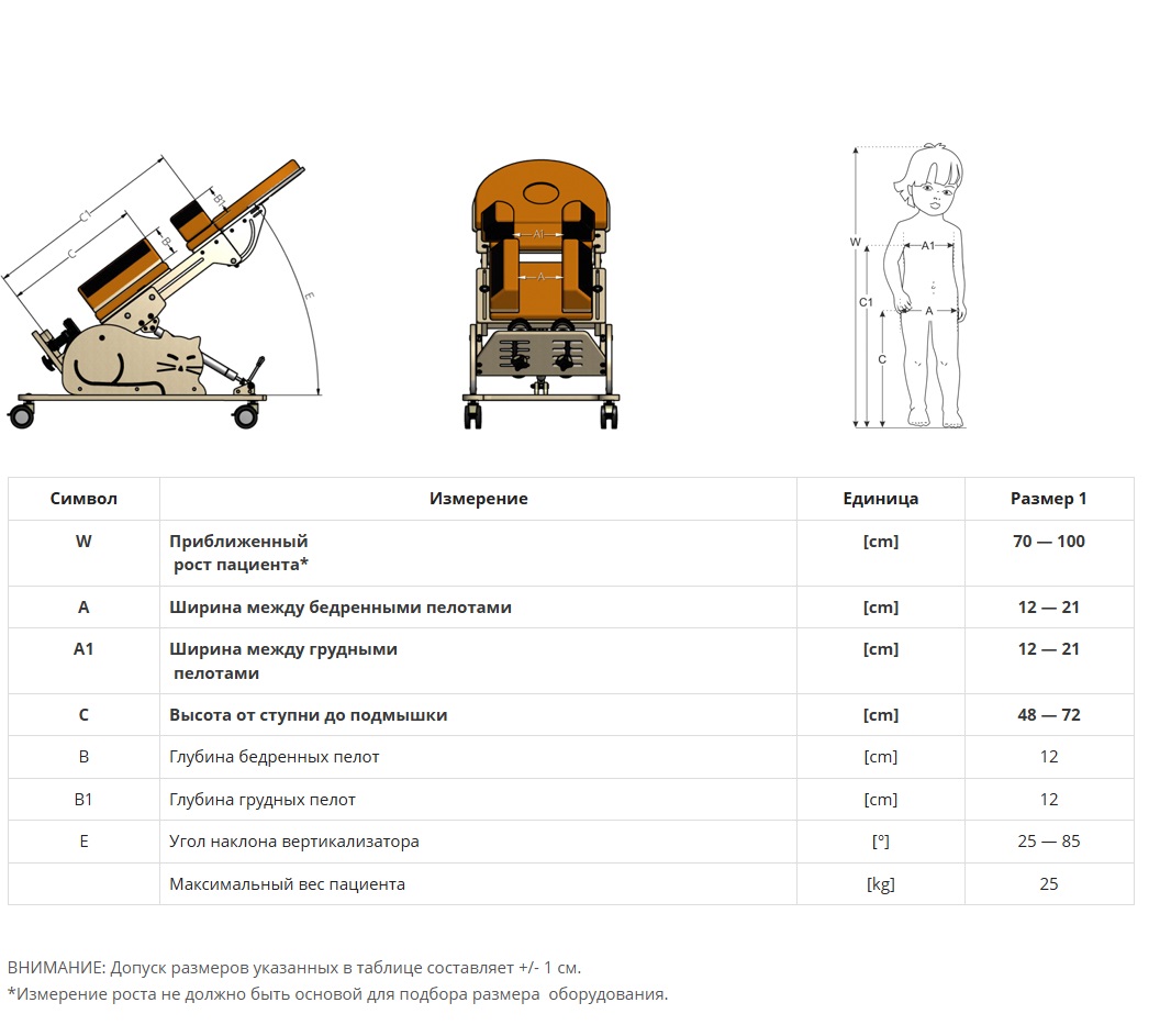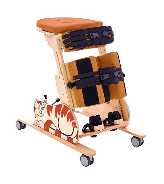 Вертикализатор КОТЕНОК I создан с мыслью о детях, вынужденных все время лежать. Он позволяет им принимать положение стоя, что дает ребенку возможность по-новому познавать окружающий мир и стимулирует его психофизиологическое развитие. Пневматический сервопривод помогает выставить нужный наклон устройства и значительно облегчает контроль над ребенком в устройстве. Расширенная система подушек и ремней безопасности обеспечивает ребенку чувство безопасности и уверенности. Из соображений заботы о ребенке продукт изготовлен из экологически чистых и безопасных материалов.Стандартная комплектацияРама на колесах с тормозами.Грудная и бедренная подушкаГрудной и бедренный ременьПодушка, поддерживающая грудная.Подушка, поддерживающая бедренная.Нижняя опора (клин межбедренный).Подножка с регулируемыми подошвами.СтоликРемни безопасностиПодушка на столикЧехол для столикаПневматический сервопривод с ножной регулировкой угла наклона2в1 ПЕРЕДНЕ и ЗАДНЕОПОРНЫЙ. Заднеопорный-убирается тарелка, устанавливается подушка на столик и можно использовать как опору для головы, выровняв столик в одну линию с опорой для туловища.