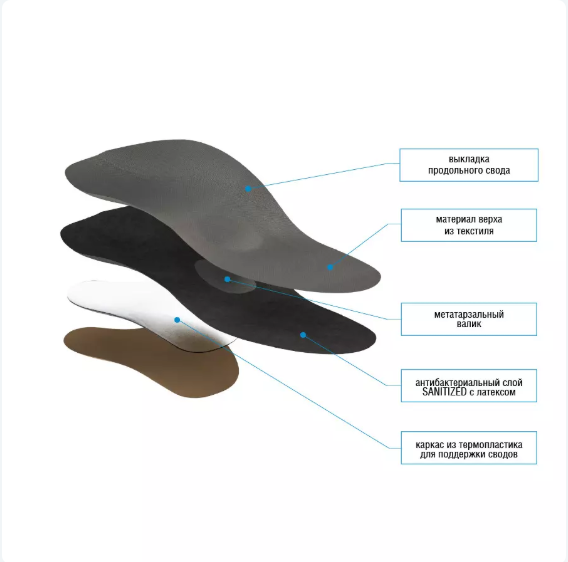 Высокий внутренний бортик предотвращает заваливание стопы внутрь.Метатарзальный валик создает поддержку поперечного свода.Материал верха хорошо впитывает влагу, стельки можно стирать.Средний слой из "Sanitized", который создает антибактериальный эффект, устраняя запах пота.Рекомендованы для обуви с жестким задником и фиксирующими элементами в подъеме (шнуровка, ремешки с застежками, липучки).